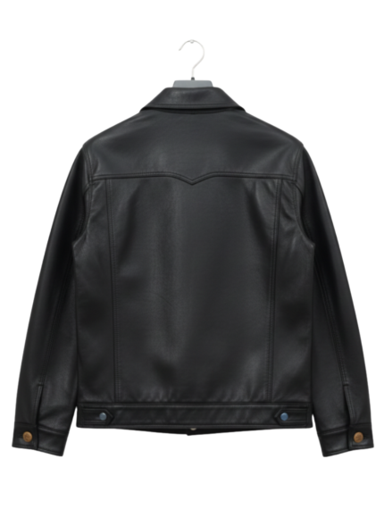 Elegant men’s black leather casual jacket with a classic collar and front zip closure. Designed for daily wear, casual outings, and light winter use.