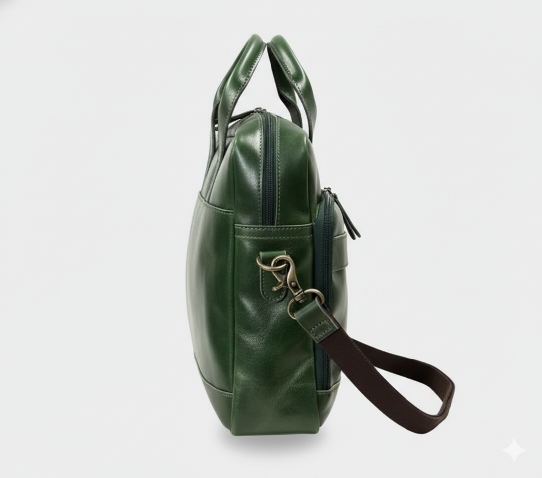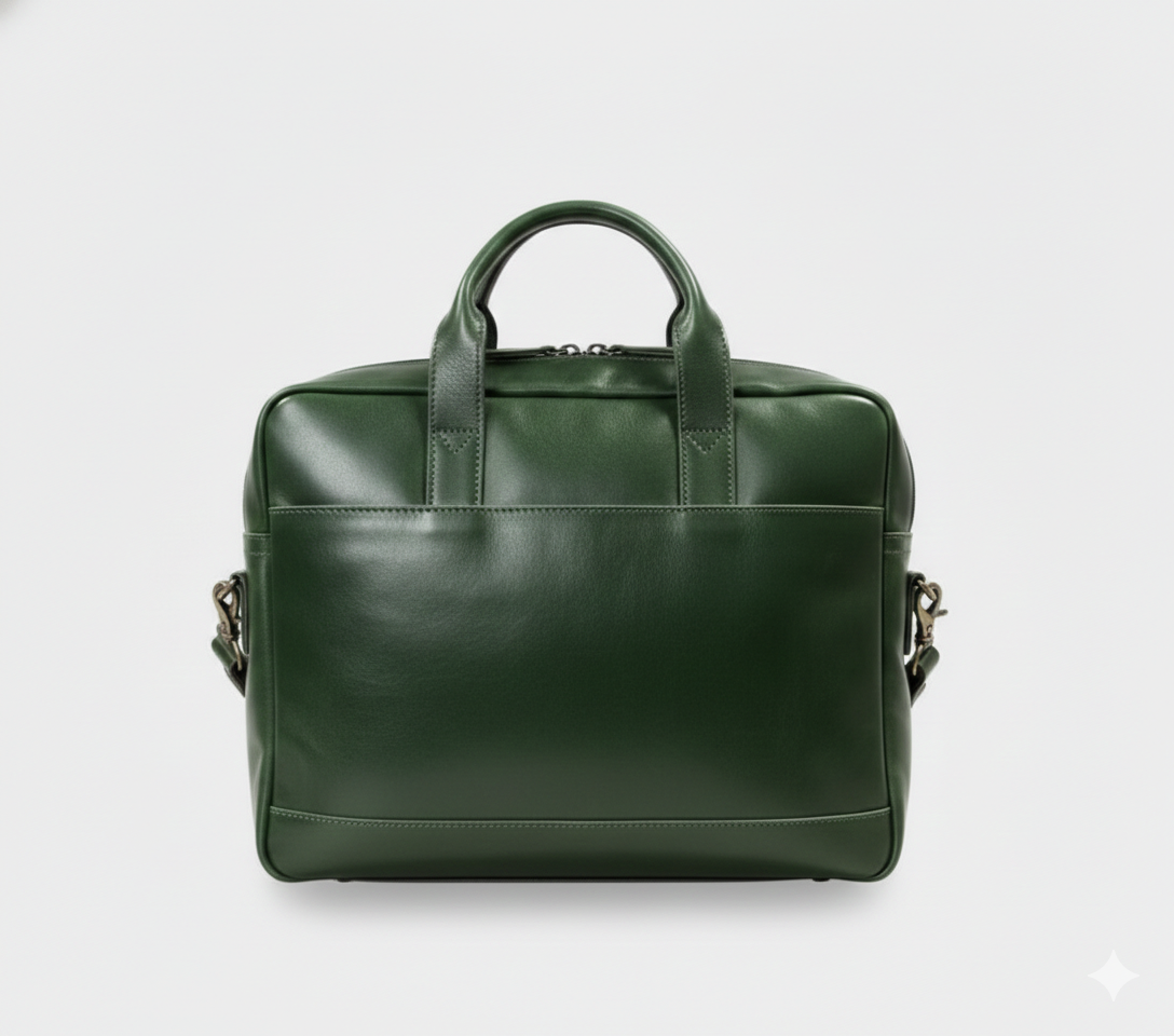 Premium men’s green leather laptop bag designed for office, business meetings, and travel. Sleek design with spacious compartments and sturdy handles.